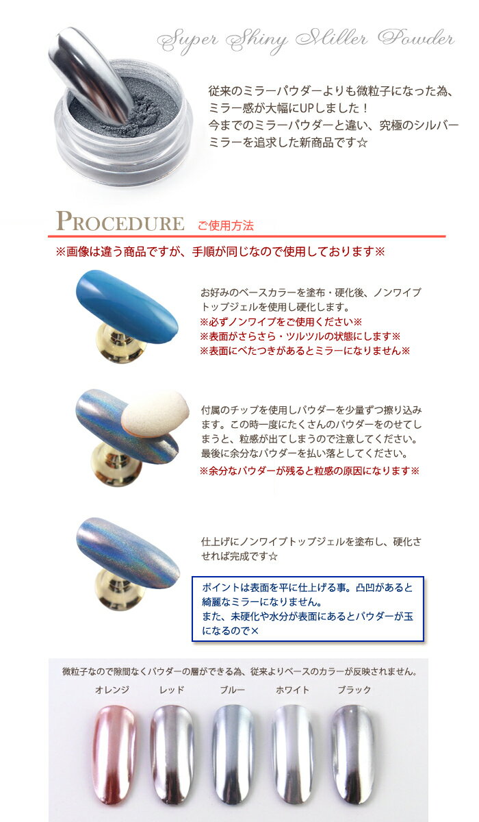 【ご注意】 インターネット上で出回っておりますミラーネイルの画像の一部ではミラーパウダーを使用した実際の写真とは異なる画像(鏡面ネイル/ネイルラップをした画像)がございます。