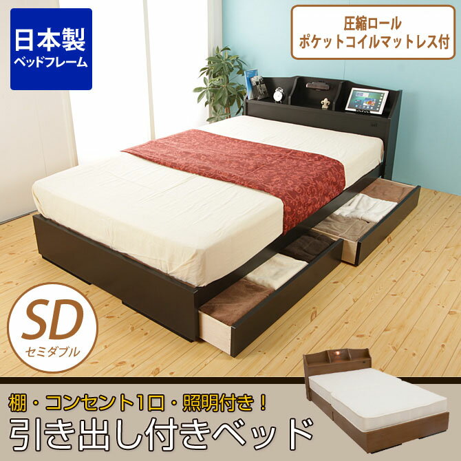商品サイズ:幅120×奥行215×高さ77cm【本体】 ■引出し内寸: (大)幅96×奥行き40×高さ10cm (小)幅90×奥行き35×高さ10cm ■材質: プリント化粧板 ■備考 照明:10W白熱灯×2個 一口コンセント付き ■日本製 ■お客様組立品 【マットレス】サイズ:幅120×長さ195×高さ17cm 梱包サイズ:34×34×122cm 【材質】2.2mmポケットコイルスプリング(コイル数/ SD:589)、 ウレタン、フェルト、ポリエステル綿混合張り地、両面多針キルティング加工 マットレス:中国製 ヘッドボードには棚・照明・一口コンセント付き収納ベッド。